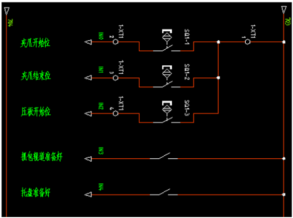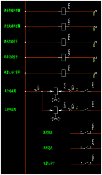 前三個為氣缸磁性開關檢測信號,后兩個為配套PLC傳送給機器人大包和托盤準備好的信號,為了實現(xiàn)電氣隔離,需要將PLC給機器人的電平信號轉化為機器人自身的電平,需要通過繼電器來實現(xiàn)。