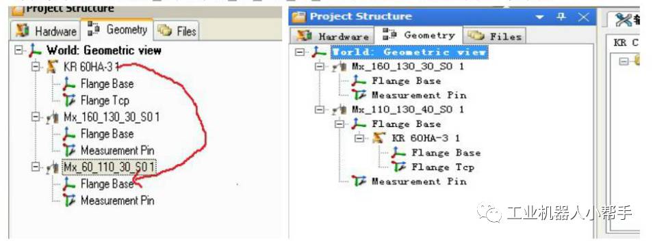 旋轉(zhuǎn)軸配置和上面步驟基本相同,不同的是配置旋轉(zhuǎn)軸不用添加完后把KR60HA_3拖拽到Mx_110_130_40_S0的FLANGE BASE下面